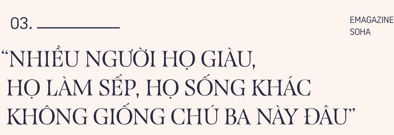 Ai chào ổng thì ổng cũng gục đầu chào bình thường. Sáng mình lau dọn mà thấy ổng, giật mình ngước lên mới nói: "Con chào chú!" Mình thấy cái vui vẻ của ổng khi ổng gật đầu chào lại là mình vui. Không có cấp trên vai vế một cái gì đâu. Chú Ba sống vậy nên anh em ai cũng thương.