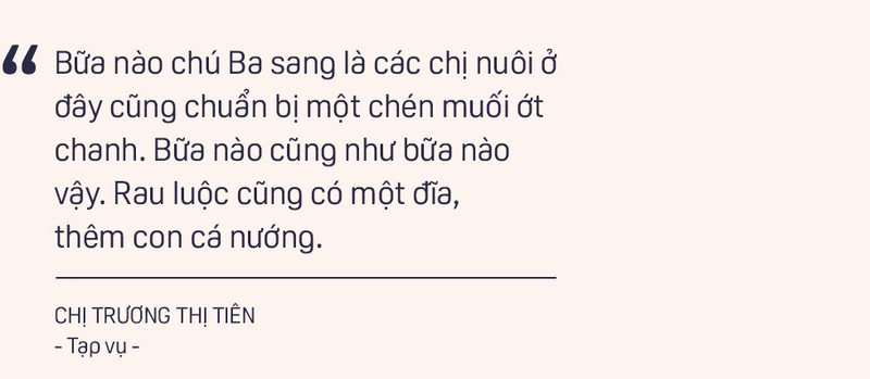 Trương Thị Tiên: Không phải chỉ có mình đâu, bữa nào chú sang là các chị nuôi ở đây cũng chuẩn bị một chén muối ớt chanh. Bữa nào cũng như bữa nào vậy. Hay lắm, như là món ruột vậy á. Rau luộc bữa nào cũng có một đĩa, thêm con cá nướng.