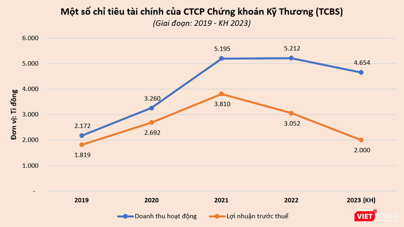 Theo đó, Hội đồng quản trị (HĐQT) TCBS trình kế hoạch kinh doanh năm 2023 với doanh thu hoạt động đạt 4.654 tỉ đồng và lợi nhuận trước thuế ở mức 2.000 tỉ đồng, lần lượt giảm 10,7% về doanh thu và 34,4% lợi nhuận so với thực hiện năm 2022.