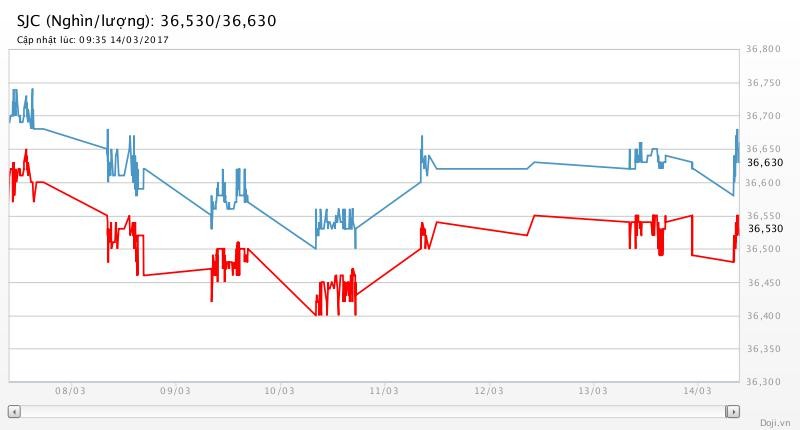 Tương tự, tại các đại lý của Doji, giá vàng miếng SJC chỉ được tập đoàn này điều chỉnh giảm 10 nghìn đồng mỗi chiều về yết ở 36,53 – 36,63 triệu đồng/lượng (MV-BR) đối với giao dịch lẻ; và đắt hơn 10 nghìn đồng chiều mua, đồng thời rẻ hơn 10 nghìn đồng chiều bán đối với giao dịch buôn ở thị trường Hà Nội. Theo đó, doãng chênh lệch 2 chiều mua - bán ở Doji đang là 100 nghìn đồng/lượng.