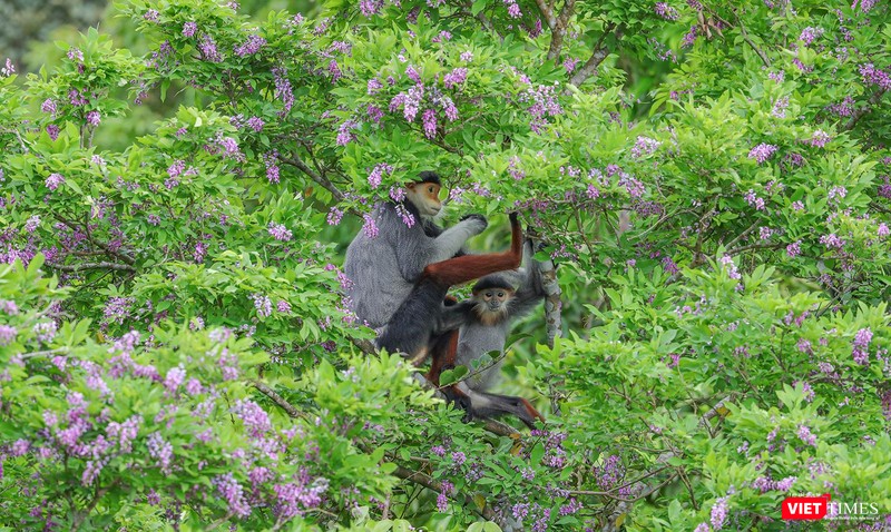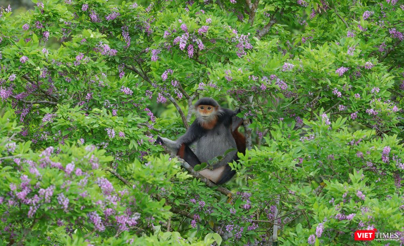 Giới mê nhiếp ảnh thiên nhiên dõi theo từng chuyển động của voọc chà vá chân nâu trên cây thàn mác tím