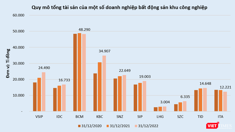 Về quy mô tổng tài sản, tính đến cuối năm ngoái, chỉ tiêu này của VSIP chỉ thấp hơn BCM (48.290 tỉ đồng) và KBC (34.907 tỉ đồng), trong khi cao hơn nhiều so với tổng tài sản của IDC (16.733 tỉ đồng), SNZ (22.649 tỉ đồng), SIP (19.003 tỉ đồng).