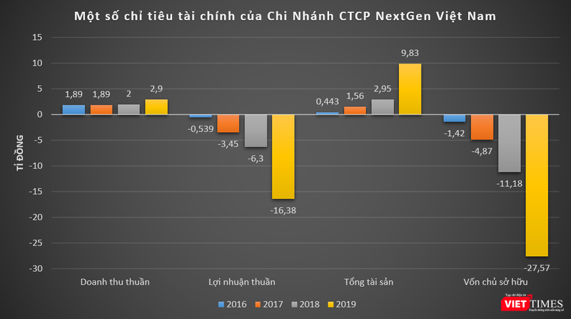 Dữ liệu của VietTimes cho thấy, trong 4 năm trở lại đây, NextGen Việt Nam liên tục báo lỗ, âm sâu vốn chủ sở hữu. Đỉnh điểm là năm 2019, doanh thu thuần của NextGen Việt Nam đạt 3,8 tỉ đồng, lỗ thuần lên đến 106 tỉ đồng. Tại ngày 31/12/2019, tổng tài sản của NextGen Việt Nam đạt 20,5 tỉ đồng, vốn chủ sở hữu ở mức âm 164 tỉ đồng.
