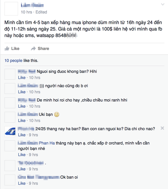 "Hiện tại, mình cần tuyển 6-8 người xếp hàng mua iPhone, thời gian xếp hàng từ 2 giờ chiều hôm trước cho đến lúc mua iPhone của ngày hôm sau. 6 USD/giờ bao ăn bữa tối và sáng", một dân buôn hiện sống ở Hà Nội, đăng tin rao vặt lên một nhóm chợ Việt Nam ở Singapore.