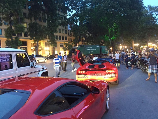 Đoàn siêu xe tại Hà Nội tụ tập muộn hơn vào chiều ngày hôm qua 19/6. Dẫn đầu đoàn là chiếc Lamborghini Aventador LP700-4 mui trần, cùng có tông màu đỏ nổi bật là "siêu ngựa" Ferrari F12 Berlinetta đầu tiên xuất hiện tại Việt Nam. Kế đến là siêu xe mui trần Ferrari California T. Ảnh: Khánh Lê.