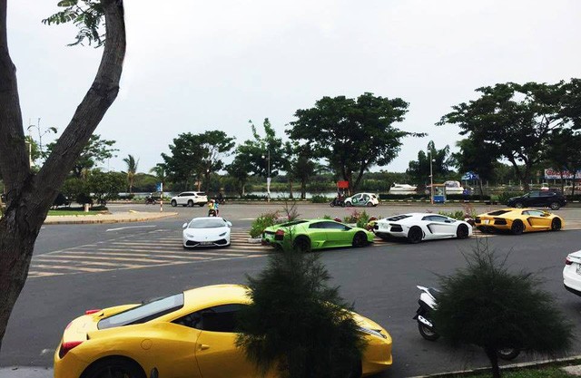 Chiều ngày 18/6, đoàn siêu xe Lamborghini và Ferrari rủ nhau tụ tập tại khu vực Phú Mỹ Hưng, Quận 7. Trong đoàn xe dễ dàng nhận thấy các đại gia Sài thành ưa chuộng thương hiệu Lamborghini với 4 chiếc xuất hiện trên phố. Ảnh: Facebook.