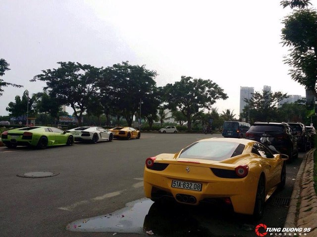 Siêu xe Ferrari 458 Italia màu vàng cũng góp mặt trong đoàn siêu xe tụ tập chiều 18/6 những đỗ khá xa. Ảnh:Tùng Dương.