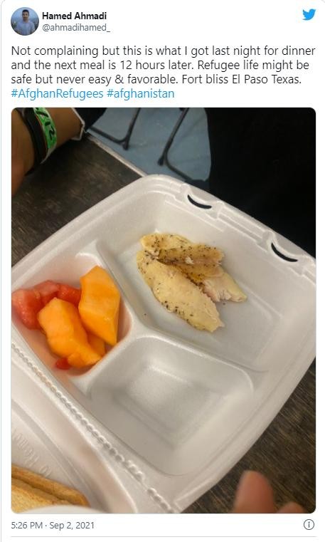 Hamed Ahmadi, phiên dịch viên 28 tuổi người Afghanistan, hồi tuần trước đăng tải một bức ảnh chụp khẩu phần ăn tối của anh lên mạng xã hội Twitter, trong đó cho thấy một vài miếng thịt gà, một chút bánh mì và hoa quả.