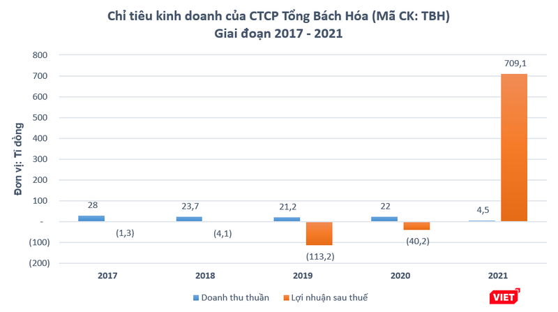 CTCP Tổng Bách Hóa (Mã CK: TBH) vừa công bố kết quả kinh doanh năm 2021, với doanh thu thuần về bán hàng và cung cấp dịch vụ đạt 4,5 tỉ đồng, giảm tới 79,5% so với năm trước. Trừ đi giá vốn hàng bán, công ty này báo lỗ gộp gần 2,4 tỉ đồng, trong khi chỉ tiêu này của năm 2020 là lãi 12,4 tỉ đồng.