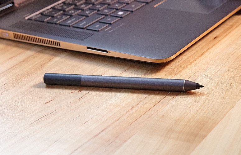 Đi kèm với máy còn có bút Stylus Active Pen để bạn có thể thao tác chính xác hơn trên màn hình cảm ứng. Chiếc bút này hỗ trợ 2048 mức độ lực khác nhau. Trên thân bút có hai nút có thể được lập trình với ứng dụng HP Pen Control để nhấp chuột phải, chụp ảnh màn hình, thay đổi âm lượng của máy tính và nhiều chức năng khác. Bút stylus dày hơn một chút so với trung bình các mẫu stylus khác và rất thoải mái khi cầm nắm. Bút Stylus giúp việc viết, vẽ, ghi chú nhanh trên Spectre X36 tiện lợi hơn hẳn. Tiếc là HP không thiết kế khe cắm bút hay tích hợp nam châm vào thân bút để dễ dàng gắn bút vào thân máy như Samsung hay Microsoft từng làm.