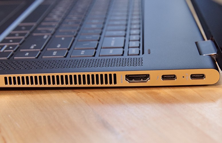 Còn phía cạnh phải có một cổng USB type C với khả năng chuyển đổi dữ liệu, sạc pin với thiết bị khác đồng thời là cổng sạc cho laptop. Ngoài ra, còn có 1 cổng Thunderbolt 3 và 1 cổng HDMI. HP cho biết công nghệ sạc nhanh của họ có thể nạp 50% pin cho máy chỉ trong nửa giờ.