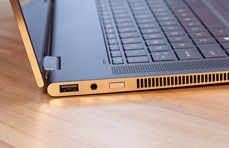 HP đang tiếp tục xu hướng tinh giản các cổng kết nối trên thiết bị cao cấp nhưng nhìn chung Spectre x360 vẫn đáp ứng các chức năng kết nối cần thiết. Cạnh bên trái của máy có một cổng USB 3.0 với khả năng sạc điện thoại kể cả khi máy ở chế độ ngủ (Sleep-and-Charge), một jack audio 3.5 và một khe cắm thẻ nhớ SD.