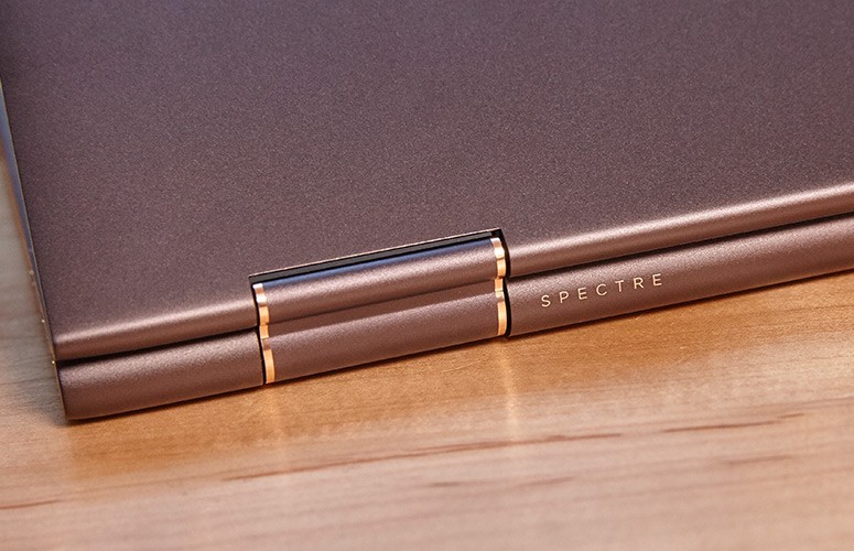 HP Spectre x360 2017 thừa hưởng thiết kế đẹp mắt của phiên bản năm ngoái, toàn bộ thân máy được tiện CNC từ một miếng nhôm nguyên khối mang lại cảm giác cao cấp và cứng cáp.