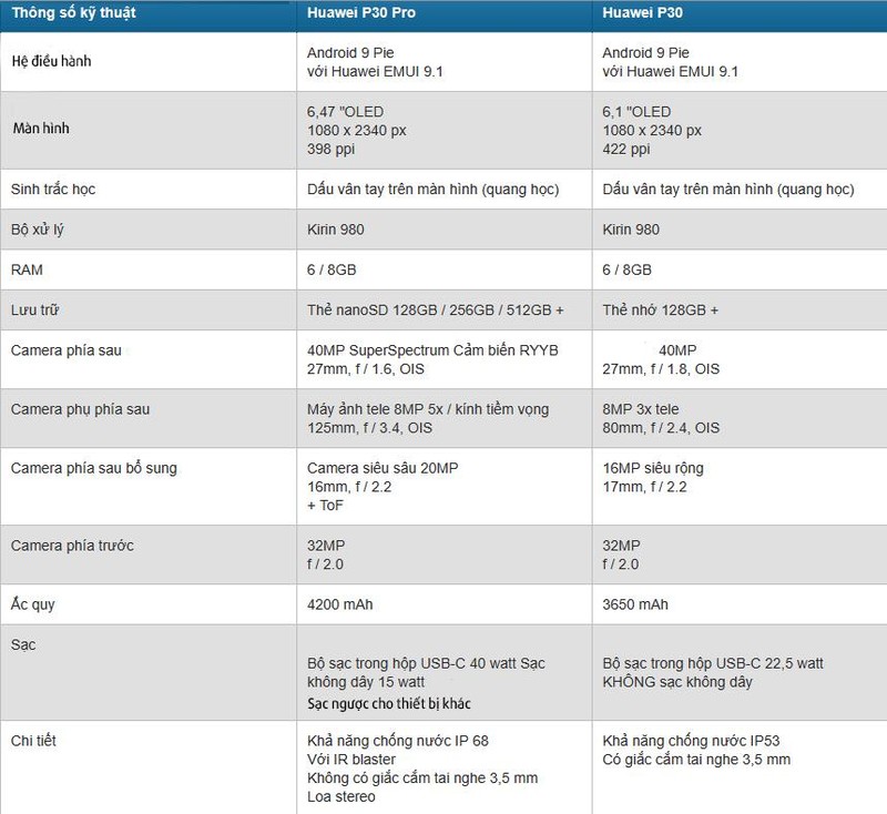 Cả hai cũng khác nhau ở chỗ P30 Pro có camera tốt hơn (P30 không có camera tiềm vọng), kích thước pin (P30 có pin nhỏ hơn) và một vài chi tiết khác như giắc cắm tai nghe 3,5 mm thực sự có trên P30 nhưng thiếu trên P30 Pro. Tuy nhiên, một đặc điểm giống nhau là hiệu năng vì cả hai đều được trang bị chip Kirin 980.