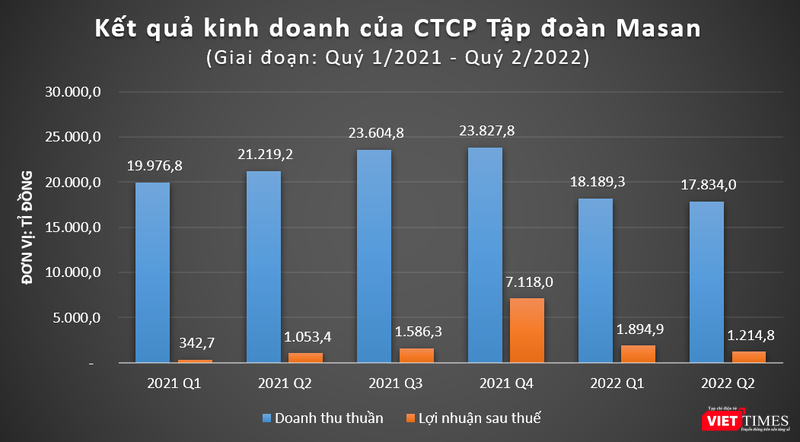 Luỹ kế 6 tháng đầu năm 2022, MSN ghi nhận doanh thu thuần đạt 36.023 tỉ đồng, giảm 12,5% so với mức 41.196 tỉ đồng của cùng kỳ năm 2021.