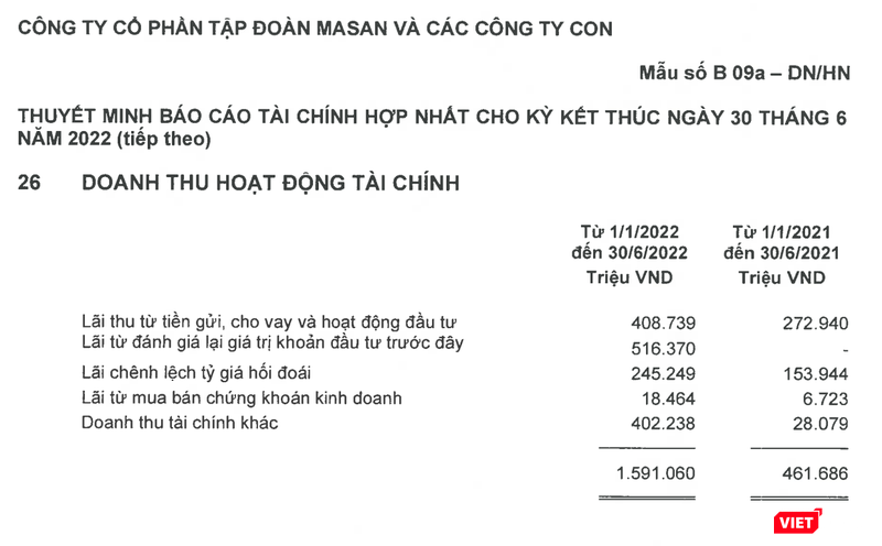 Bên cạnh hoạt động kinh doanh chính, trong nửa đầu năm 2022, MSN còn ghi nhận tới 1.591 tỉ đồng doanh thu hoạt động tài chính, cao gấp 3,4 lần so với cùng kỳ năm trước.