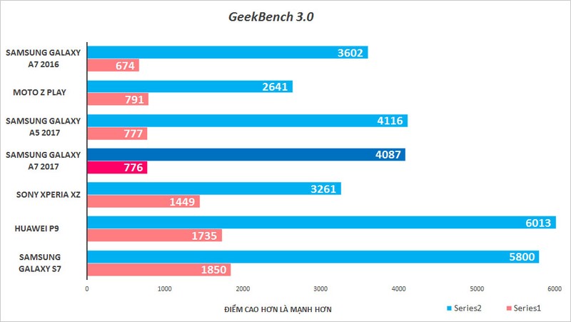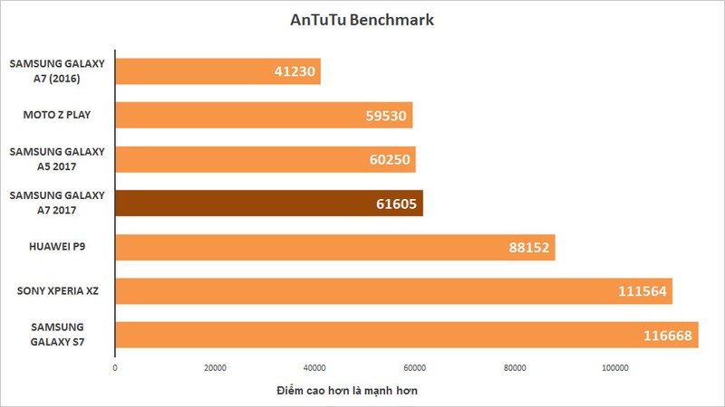 Hiệu năng của A7 2017 mạnh mẽ hơn nhiều so với thế hệ trước, nhưng vẫn không so được với máy cao cấp