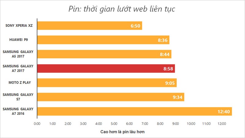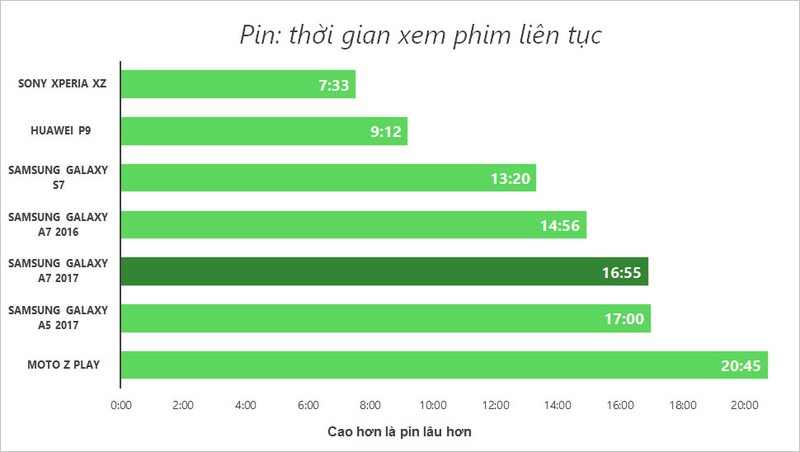 Với những bài đánh giá pin tiêu chuẩn của VnReview, kết quả Galaxy A7 đạt được cũng rất ấn tượng, vượt trội so với bản 2016 và nhiều smartphone trong cùng tầm giá. Do hỗ trợ sạc nhanh nên A7 chỉ mất 1,5 giờ để sạc từ trạng thái hết sạch pin tới khi pin đầy 100%.