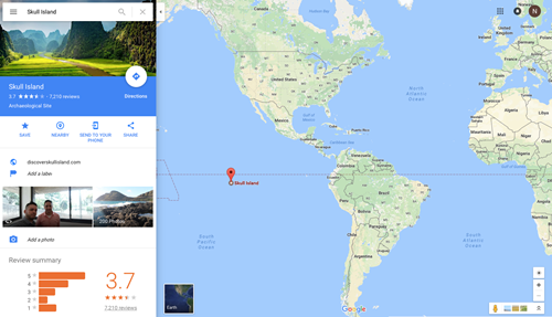 Chỉ cần tìm kiếm với từ khóa "Skull Island", Google Maps sẽ đưa bạn tới một điểm được đánh dấu gần xích đạo. Tuy hình dáng của hòn đảo không hiện trên bản đồ (vì thực chất đây là một vùng đất giả tưởng) nhưng những thông tin về địa điểm này vẫn được bổ sung khá đầy đủ. Google Maps liệt Đảo đầu lâu vào danh sách "địa danh khảo cổ", hình ảnh đại diện chính là quang cảnh của vùng đất Ninh Bình, nơi được chọn làm bối cảnh chính để quay phim và mọi người dùng đều có thể đăng tải những bức ảnh cùng những bài đánh giá tưởng tượng của mình về Đảo đầu lâu.