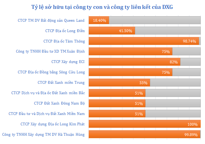 Hiện DXG đang có vốn đầu tư tài chính vào 12 công ty con và công ty liên kết. Trong đó khoản đầu tư cho công ty liên kết liên doanh tính đến thời điểm 30/6/2015 là 350,5 tỷ đồng.
