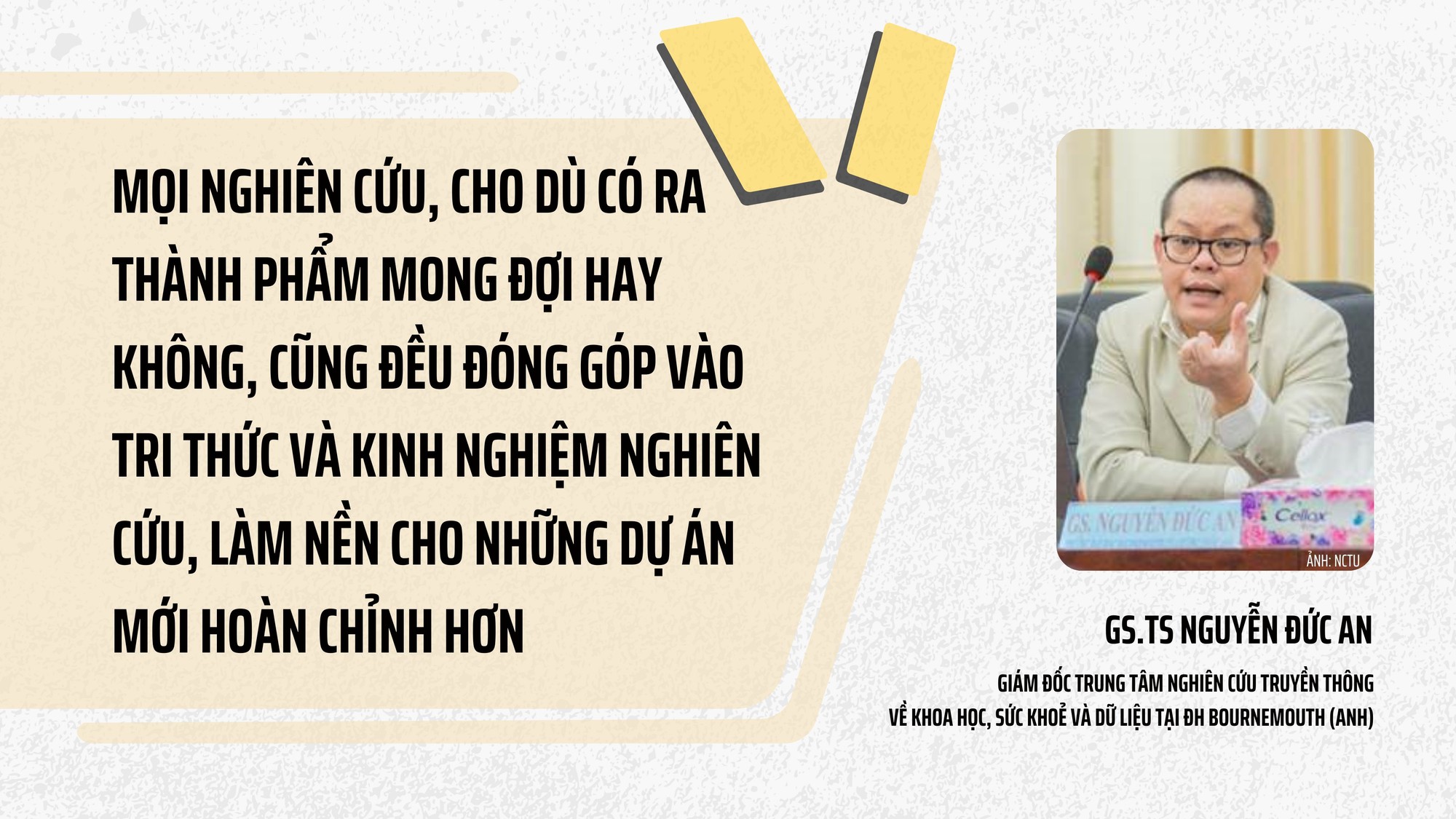 - Tôi nghĩ phải quay về với bản chất khoa học: đó là một quá trình tích luỹ tri thức qua thời gian và không gian: mọi nghiên cứu, cho dù có ra thành phẩm mong đợi hay không, cũng đều đóng góp vào tri thức và kinh nghiệm nghiên cứu, làm nền cho những dự án mới hoàn chỉnh hơn.