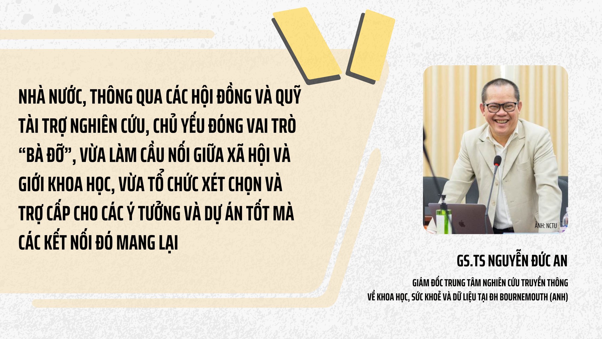 Trong phần lớn các trường hợp, tôi thấy phải vận hành theo chiều ngược lại: nhu cầu khởi phát từ dưới lên, tức từ thực tiễn đời sống, kinh doanh, sản xuất…, được các tổ chức, doanh nghiệp, cộng đồng nhận diện và tìm đến giới khoa học để giải quyết. Nhà nước, thông qua các hội đồng và quỹ tài trợ nghiên cứu, chủ yếu đóng vai trò “bà đỡ”, vừa làm cầu nối giữa xã hội và giới khoa học, vừa tổ chức xét chọn và trợ cấp cho các ý tưởng và dự án tốt mà các kết nối đó mang lại.