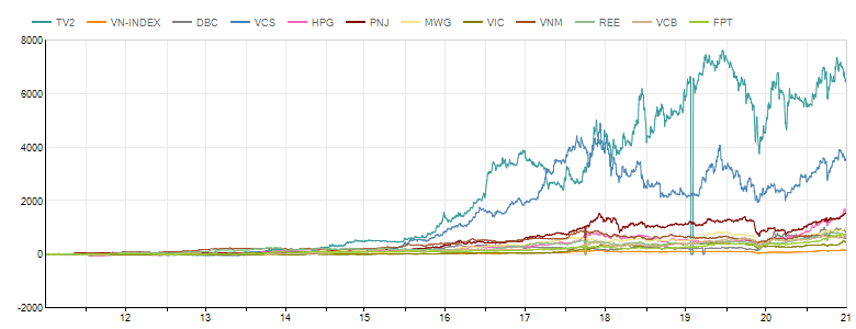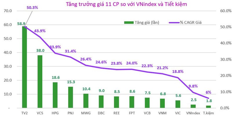 Trong các cổ phiếu được thống kê, TV2 tăng 58,9 lần trong 10 năm hay CAGR 50,3%/năm; DBC tăng 9 lần hay 24,6%/năm, trong khi VNindex tăng 2,5 lần trong cùng giai đoạn, tương ứng CAGR là 9,8%/năm. Gửi tiền tiết kiệm với lãi suất 6%/năm, giá trị cuối kỳ tăng 1,8 lần: