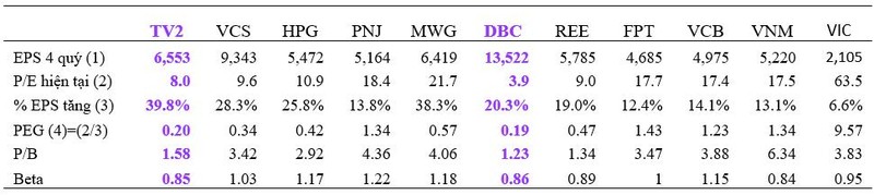 - Tỷ suất PEG, nếu sử dụng tỷ lệ tăng trưởng EPS của 10 năm gần nhất (dòng 3 bảng trên), PEG của DBC & TV2 chỉ là 0,19 và 0,2 thấp hơn 9,3 lần so với 9 CP còn lại là 1,86. Các chuyên gia tài chính và trang web tài chính lớn như fool.com đưa ra lời khuyên nếu PEG < 0,5 mua ngay cổ phiếu đó.