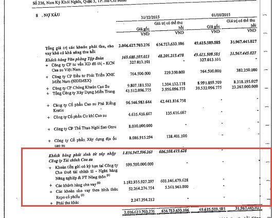 Cũng trong thuyết minh BCTC của mình, VRG cũng cho biết, “giá trị có thể thu hồi” thấp hơn nhiều lần “giá gốc”; Cụ thể, các khoản cho khách hàng vay, giá gốc là 3.383 tỷ đồng nhưng “Giá trị có thể thu hồi” chỉ là 603 tỷ, Các khoản cho vay theo hình thức Repo cổ phiếu có giá gốc là 52 tỷ nhưng “Giá trị có thể thu hồi” chỉ vỏn vẹn 5,4 tỷ đồng.