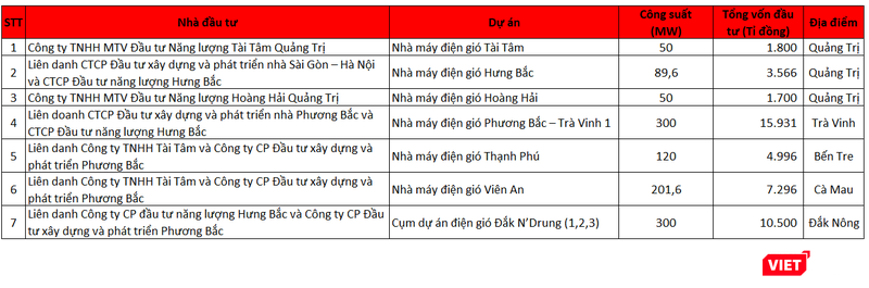 Trong khi đó, liên danh Tài Tâm – Phương Bắc là nhà phát triển các dự án Nhà máy điện gió Thạnh Phú (công suất 120MW, tổng vốn đầu tư 4.996 tỉ đồng) và Nhà máy điện gió Viên An (công suất 201,6MW, tổng vốn đầu tư 7.296 tỉ đồng).