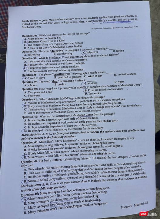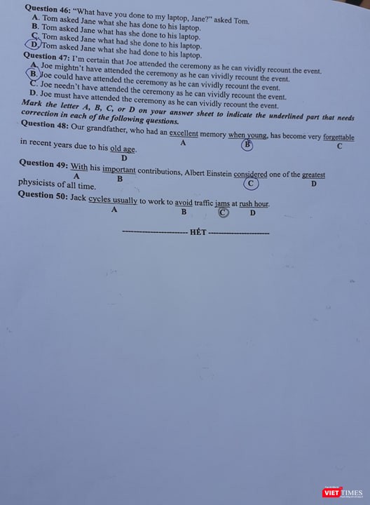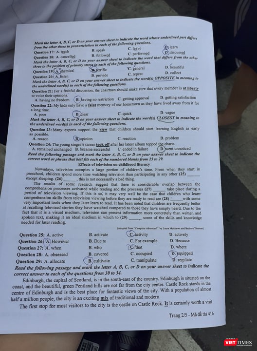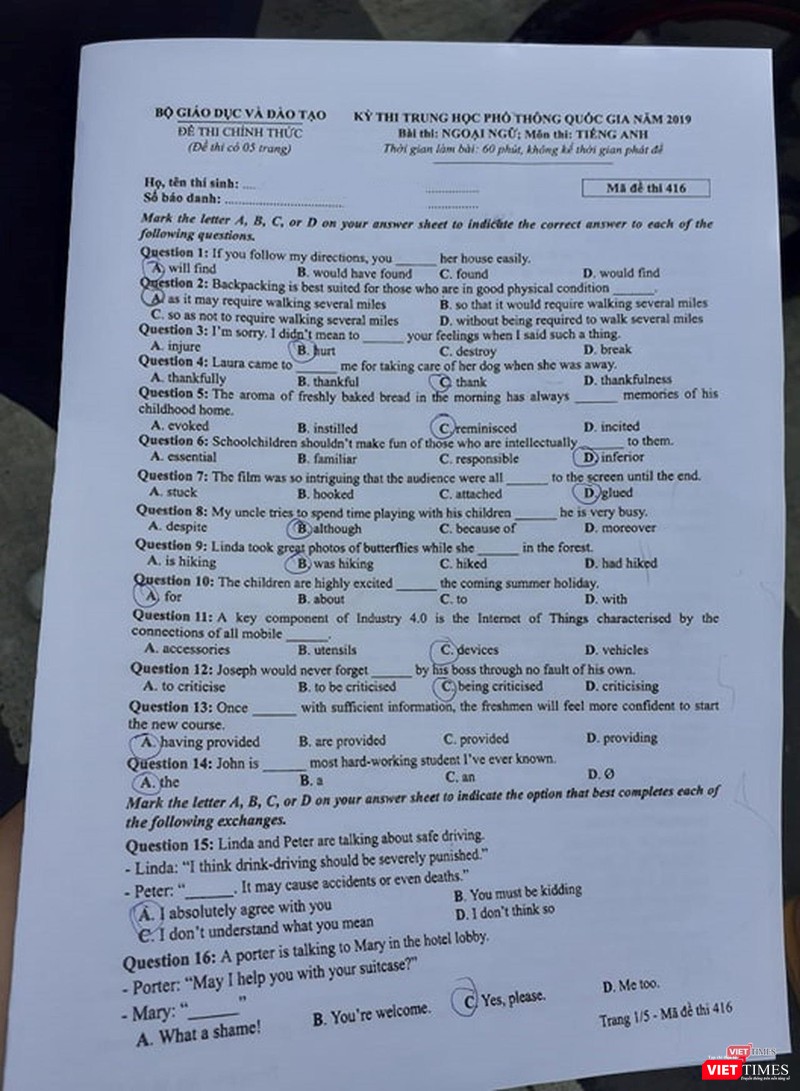 VietTimes -- Chiều nay (26/6), thí sinh tiếp tục ngày thi thứ hai kỳ thi THPT Quốc gia 2019 với bài thi trắc nghiệm môn tiếng Anh, thời gian 60 phút. Bước ra khỏi phòng thi, nhiều thí sinh thở phào vì cho rằng đề không khó, ngoại trừ một vài câu khó ở phần từ vựng.