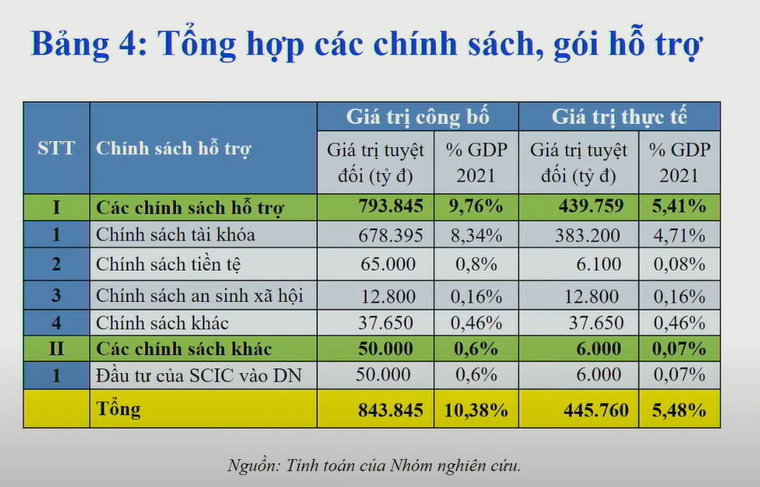 Do đó, nhóm chuyên gia đã đề xuất gói hỗ trợ lên tới 843.845 tỉ đồng, tương đương 10,38% GDP 2021, trong đó chủ yếu là chính sách tài khoá lên tới 678.395 tỉ đồng.