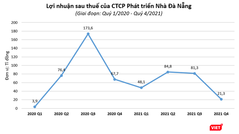 CTCP Đầu tư phát triển Nhà Đà Nẵng (Mã CK: NDN) vừa công bố kết quả kinh doanh quý 4/2021 với tổng doanh thu đạt 107,9 tỉ đồng, giảm 48% so với cùng kỳ năm trước. Trừ đi chi phí, công ty này báo lãi sau thuế 21,3 tỉ đồng, giảm 68,5% so với cùng kỳ năm 2020.