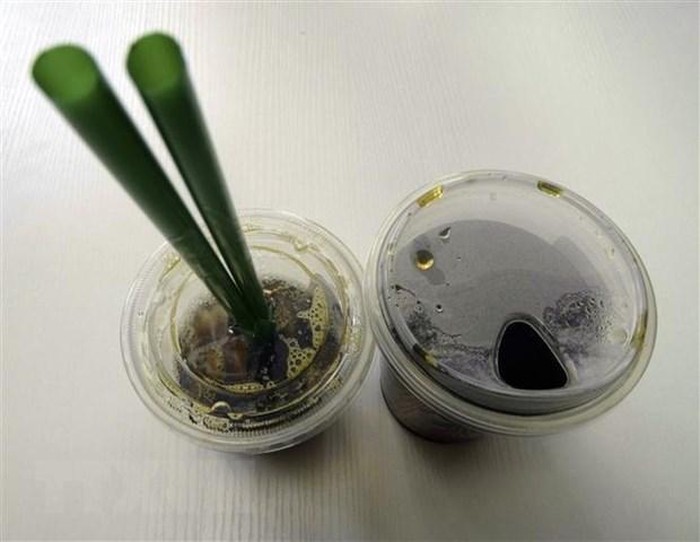 Cốc càphê sử dụng ống hút nhựa (trái) của Starbucks sẽ được thay thế bằng cốc nhựa với nắp đậy có khe hở (phải). (Ảnh minh họa: AFP/TTXVN)