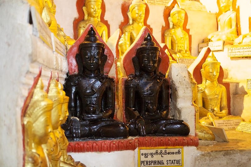 Hai bức tượng Phật “đổ mồ hôi” có màu đen được đặt tại chùa hang Pindaya, bang Shan, Myanmar. Lý do cho tên gọi này là vì trong số hơn 8,000 tượng Phât tại Pindaya, hơi ẩm chỉ xuất hiện trên hai bức tượng này, cảm giác như đang toát mồ hôi. Đặc biệt du khách và các tín đồ đến hành hương đều không thể dán bất kỳ lá vàng nào lên trên hai bức tượng. Đây là một điều “bí ẩn” bởi phần lớn các tượng Phật ở Myanmar, như Mahamuni, đều được dân chúng dán rất nhiều lá vàng. Cũng có ý kiến cho rằng do những tượng Phật nằm trong hang động, không khí ẩm ướt nên khó dát vàng.
