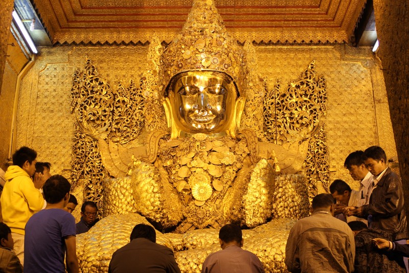 Mahamuni được làm bằng đồng, cao 3.8m, nặng 6 tấn. Trải qua hàng trăm năm, bất kể khách hành hương nào tới chùa Mahamuni cũng dát lá vàng lên bức tượng để tỏ lòng thành kính với Đức Phật, khiến lớp vàng bao quanh bức tượng siêu dày và có bề mặt xù xì như da cóc.