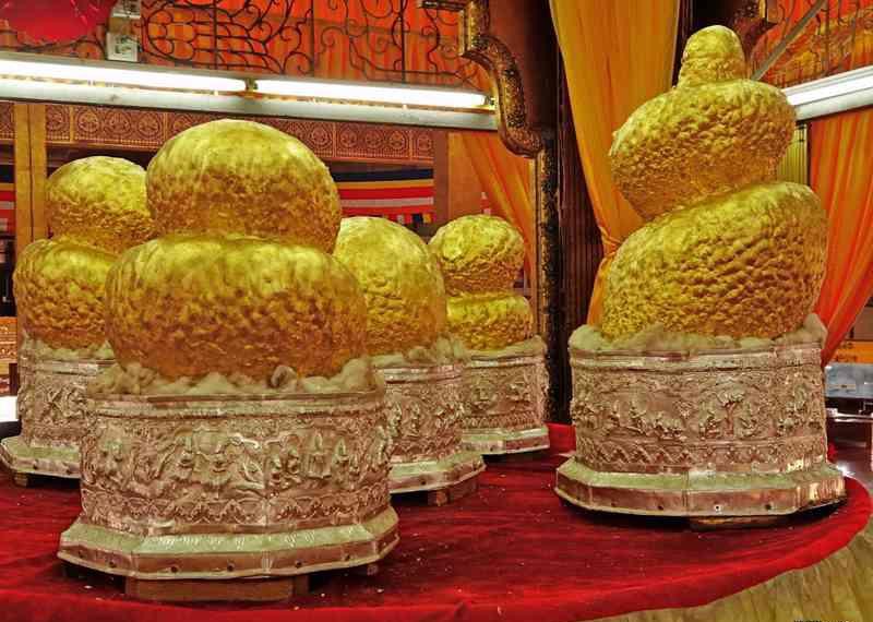 Ban đầu, năm bức tượng Phật nhỏ này có hình hài của Phật như những bức tượng khác. Nhưng do được phủ hàng ngàn lá vàng mỏng, năm bức tượng này đã không còn hình dạng như ban đầu.
