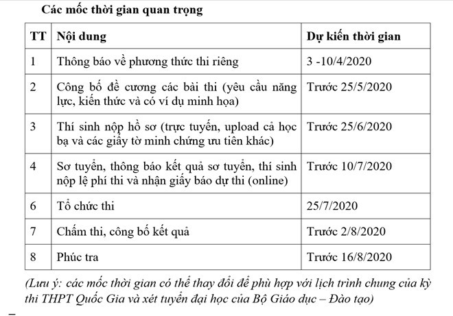 Trường đại học Bách khoa Hà Nội dự kiến dành không quá 70% tổng chỉ tiêu của từng khối ngành, đối với từng ngành/chương trình không quá 80%, cho phương thức xét tuyển dựa vào kỳ thi riêng. Tỉ lệ này có thể thay đổi trong trường hợp có sự biến động lớn về kỳ thi THPT quốc gia 2020.