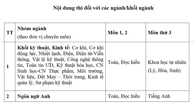 Đối với ngành ngôn ngữ Anh, các thí sinh thi 1 buổi với bài thi trên giấy 2 môn/bài thi là toán (85 - 90 phút) và đọc hiểu (30 - 35 phút), tổng thời lượng bài thi trên giấy 120 phút. Môn thứ ba là tiếng Anh (90 phút), các em thi trên máy tính.