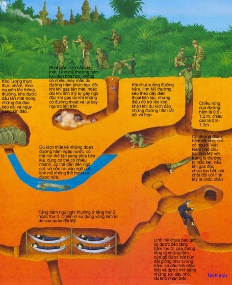 Nhưng du kích quân thông minh và khéo léo Việt nam, để tiết kiệm sức lực và thời gian, đã đào những đường hầm không sâu lắm, nhưng tính toán thiết kế sao cho, dù trong những trường hợp xe tăng và xe bọc thép di chuyển trên nóc hầm, phía trên bị nã pháo và ném bom- các đường hầm cũng không bị sụt, lún, sập và vẫn bển bỉ phục vụ những người đã xây dựng lên.