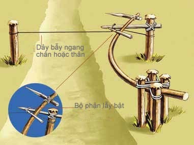 Bẫy mũi xiên. Một mẫu kết hợp giữa nỏ của người Tây nguyên và ống phóng xiên cá đồng bằng Bắc bộ, mũi xiên được nén lại bằng lò xo hoặc đặt trên dàn phóng căng của dây cao su, hãm bằng chốt cành cây với 1 sơi dây cước dùng thể tháo chốt hãm, khi lính Mỹ đá vào dây, chốt hãm bung ra và mũi xiên, đã được nhiễm bẩn – có thể là dầu máy hoặc máu cá xuyên ngang người hoặc ống chân, bắp đùi, đảm bảo chắc chắn nhiễm trùng máu.