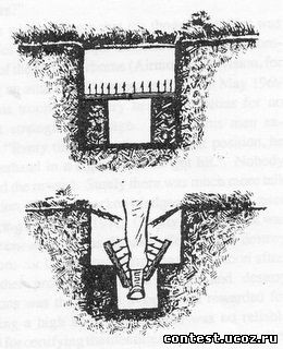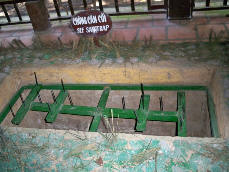 Khi lính Mỹ bước lên trên hố và dẫm tụt thanh chống, anh ta sẽ rơi xuống và giang hai tay ra chống đỡ cú thụt hố, hai tấm ván với những cái đinh di chuyển vào giữa găm vào thân thể người lọt bẫy.