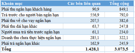 Bên cạnh khoản nợ phải trả với HĐQT, Địa ốc Hoàng Quân còn có dư nợ phải thu, phải trả tương đối lớn với đối với các doanh nghiệp liên quan. Cụ thể như sau: