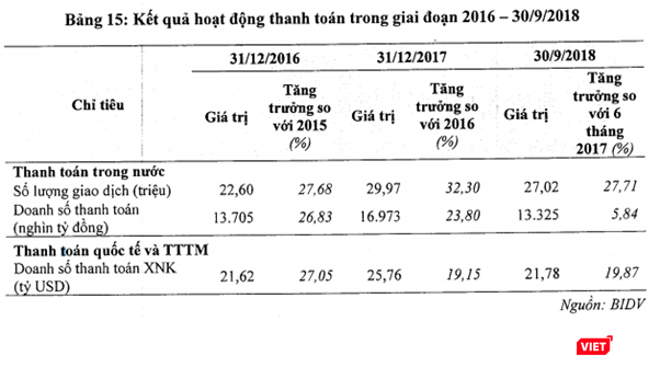 Đi cùng với tăng trưởng của số lượng giao dịch, doanh số thanh toán của BIDV cũng duy trì tốc độ tăng trưởng tốt. Cụ thể, tốc độ tăng trưởng của năm 2016 và năm 2017 so với các năm trước lần lượt là 26,83% và 23,8%. Tính tới ngày 30/9/2018, BIDV ghi nhận giá trị doanh số thanh toán đạt 13.325 nghìn tỷ đồng (tăng trưởng 5% so với 6 tháng 2017).