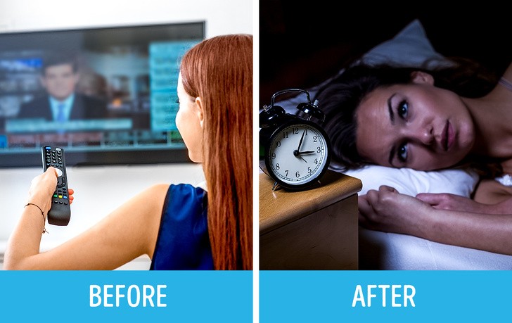 Xem TV trước khi ngủ là xu hướng toàn cầu. Nhưng trên thực tế, bạn không nên làm điều đó vào buổi tối vì thông tin và ánh sáng nhân tạo từ TV kích thích chức năng của não và có thể làm giảm lượng melatonin điều chỉnh giấc ngủ.