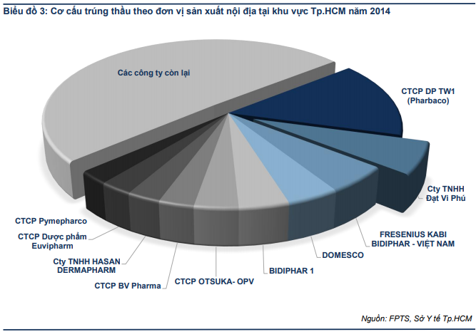 “Trong đó, CTCP Dược phẩm TW1 (Pharbaco) là nhà sản xuất dược phẩm có giá trị trúng thầu cao nhất tại khu vực Tp.HCM trong năm 2014 với tổng giá trị gần 329 tỷ đồng ~ 15% tổng giá trị trúng thầu (giá trị này bao gồm thuốc do Pharbaco tự đấu thầu và thuốc Phabarco sản xuất cung ứng cho các đơn vị khác để tham gia đấu thầu). Đặc biệt, vượt qua nhiều tên tuổi lớn khác trong ngành như Domesco, Bidiphar, OPV…” - báo cáo phân tích của công ty chứng khoán này cho biết.