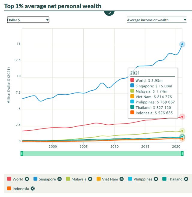 Nếu xét tài sản trung bình của top 1% dân số giàu nhất, thì top 1% dân số giàu ở Singapore có tài sản trung bình lên tới 15,08 triệu USD. Con số này ở Malaysia là 1,74 triệu USD, Philippines là 769.667 USD và Indonesia là 526.685 USD.