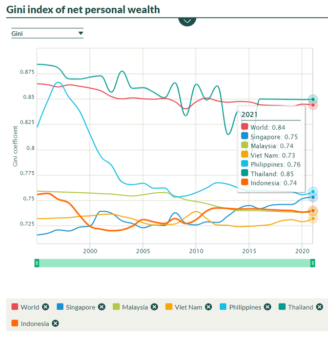 1% người giàu nhất ở các quốc gia ASEAN-6 khác cũng đều chi phối tới khoảng 30% tài quốc gia (Singapore là 31,2%, Malaysia là 29,1%, Philippines là 32% và Indonesia là 29,4%).