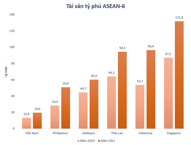 Trong năm 2021 vừa rồi, tính đến ngày 28/12, trong nhóm ASEAN-6, chỉ có duy nhất Việt Nam là giữ nguyên số lượng, còn các quốc gia Đông Nam Á khác đều có sự xuất hiện của các tỷ phú mới.