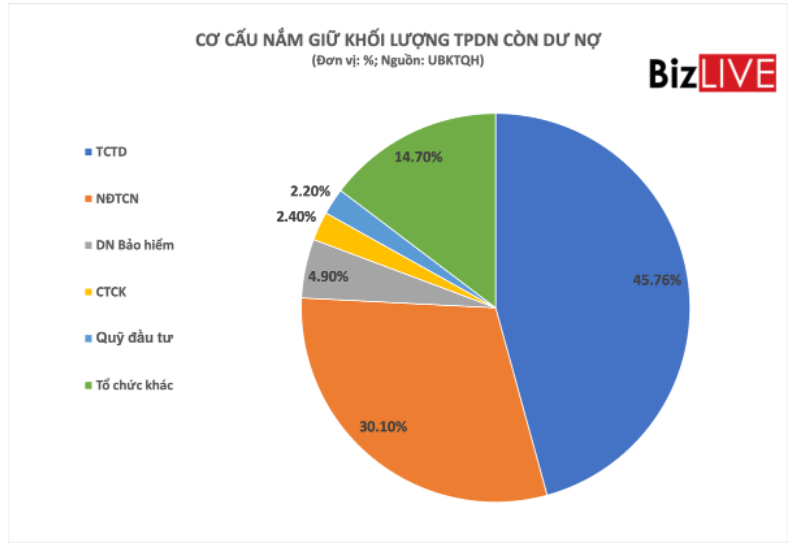 Xét về cơ cấu nhà đầu tư nắm giữ, các TCTD nắm giữ 45,76% tổng khối lượng trái phiếu còn dư nợ, các nhà đầu tư cá nhân nắm giữ 30,1%, các doanh nghiệp bảo hiểm nắm giữ 4,9%, công ty chứng khoán và quỹ đầu tư nắm giữ lần lượt 2,4% và 2,2%; các tổ chức khác nắm giữ 14,7%.